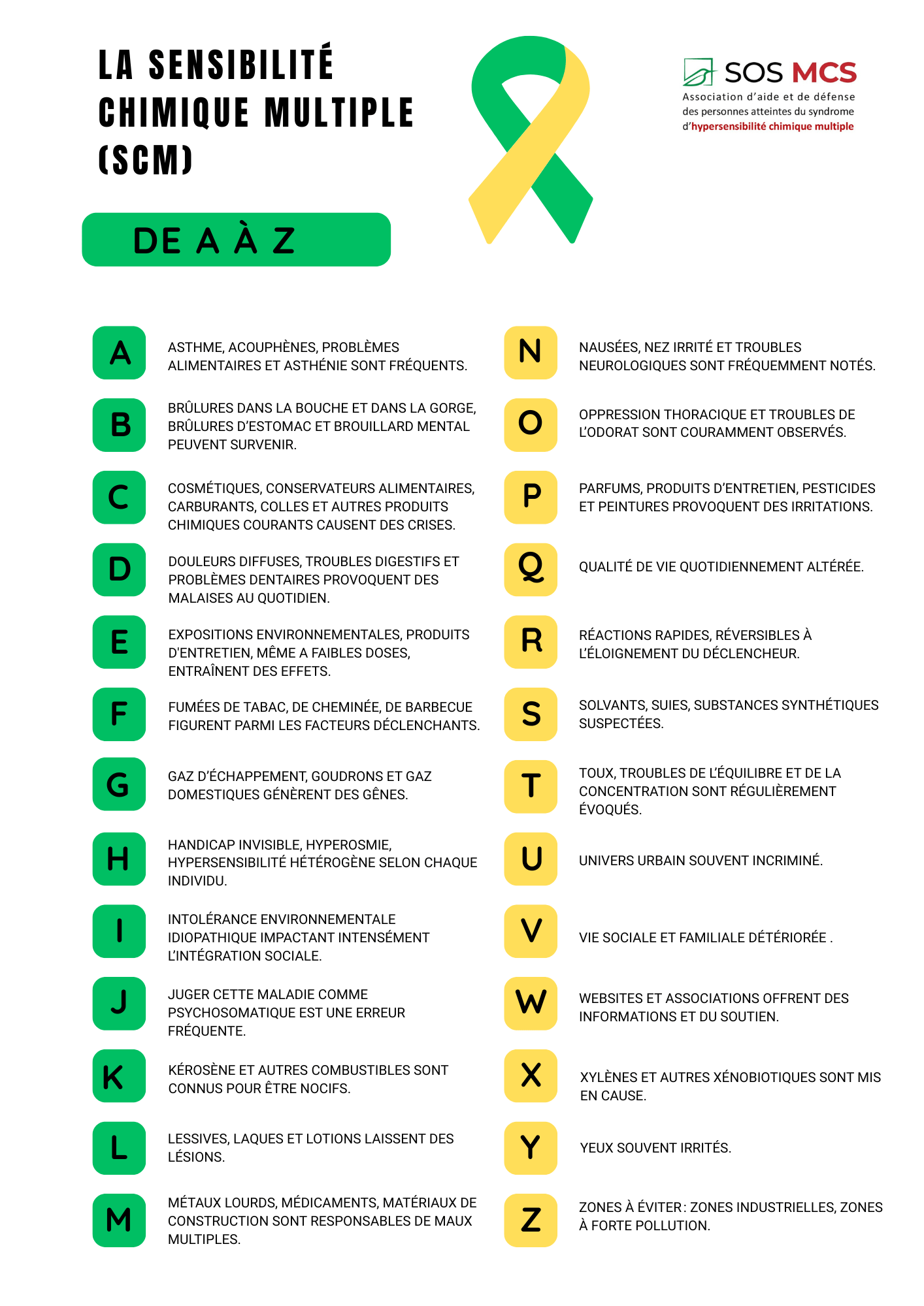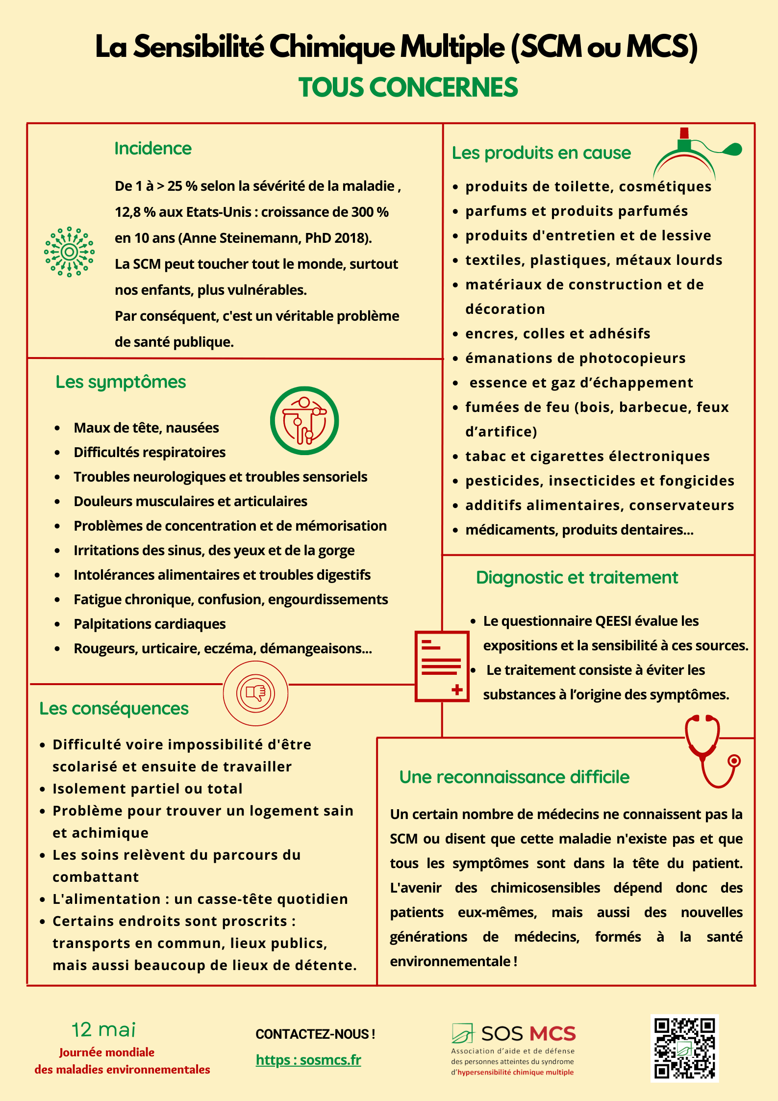 Notre dépliant et nos affiches Vous pouvez télécharger nos affiches et notre dépliant : L’hypersensibilité Chimique Multiple tous concernés, 10 écogestes, La SCM de A à Z, Quelques bonnes pratiques… Dépliant Téléchargez le dépliant Affiches Téléchargez l'affiche Téléchargez l'affiche Téléchargez l'affiche Téléchargez l'affiche